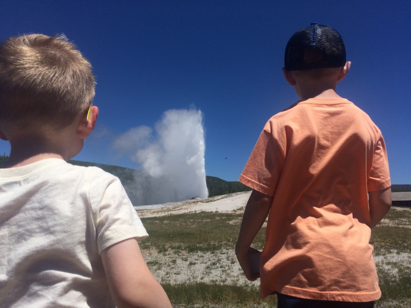 We spend a good hour at the springs and reach Old Faithful by midday. With a 40 minute wait until the next estimated eruption, we wander into the Old Faithful Inn (another recommendation as the interior of the historic lodge and restaurant is amazing). The line for ice cream is too long, so we promise the kids a treat after the timed geyser display and set off to find our seats for the show.