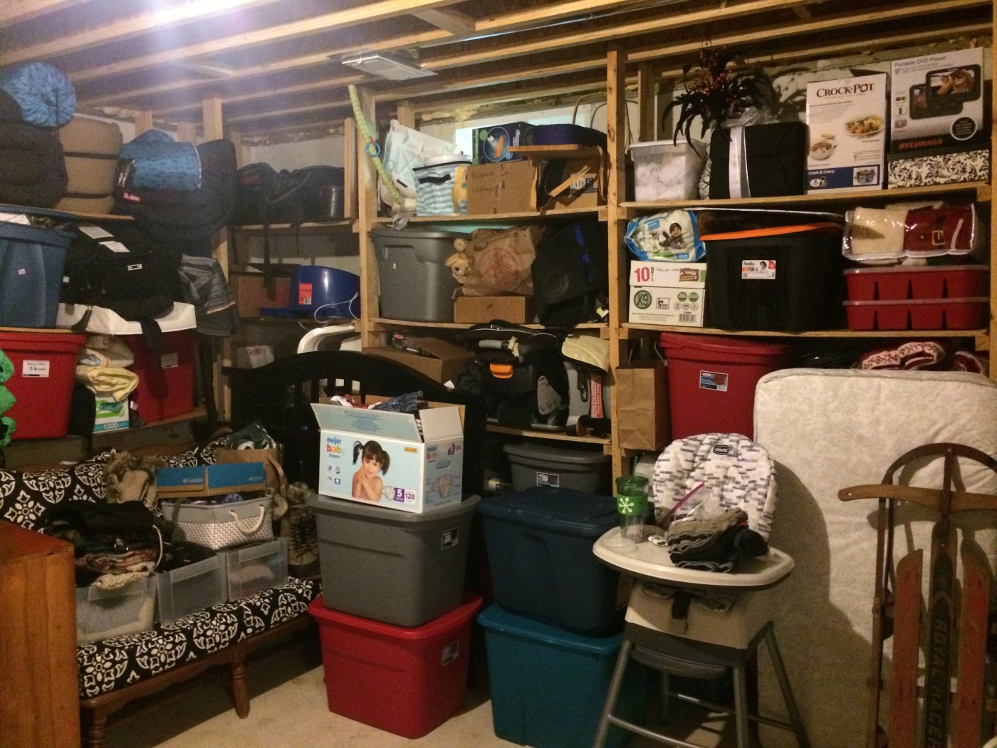 After thorough examination and a mountain set aside for donation, the items I decided to save in the nicely organized, color-coded totes came in handy once and would come in handy again to clothe a child, to feed a child, to provide me a 15-minute breather while this child jumped around in an illuminated walker-on-wheels, and I recomposed myself in the kitchen. Called a friend. Cried a little. Cried a lot. Wondered why I thought we had room for anything else in this overflowing life we live.